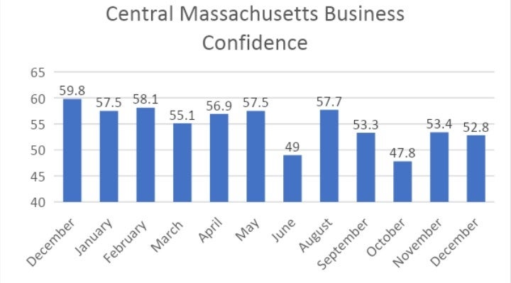 The Central Massachusetts Business Confidence Index fell six tenths of a point in December to 52.8, according to the Worcester Regional Chamber of Commerce and Boston-based Associated Industries of Massachusetts.