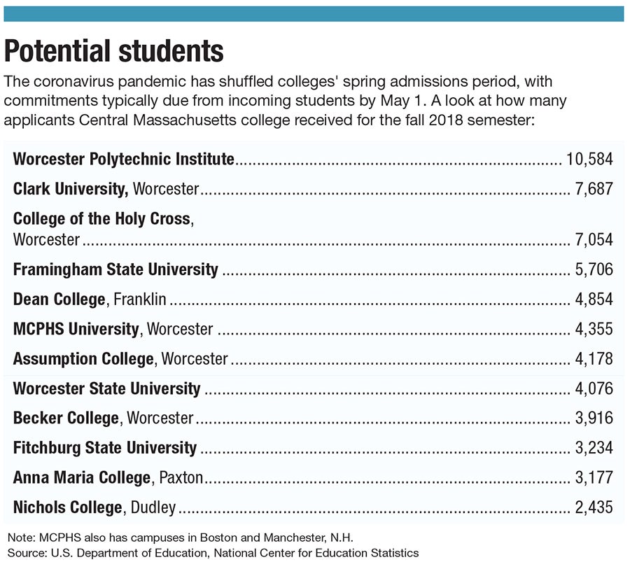 College leaders in Central Massachusetts are grappling with an upturned admissions period and wondering what fall enrollment will look like if students decide they don’t want to – or are unable to – travel far for school, or even whether a fall semester would be able to take place on campus anyway.