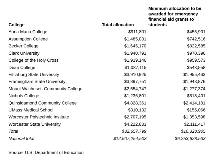 Colleges in Central Massachusetts are receiving nearly $33 million in federal aid to help make ends meet during the coronavirus pandemic.