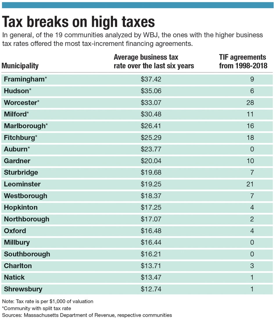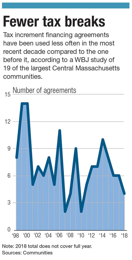 A Worcester Business Journal examination of 148 tax breaks given by 19 of the largest Central Massachusetts communities in the past 20 years shows local governments have varying philosophies with how tax breaks should be used as an economic development tool. Worcester has signed 28 such agreements, Leominster has made 21 and Fitchburg has made 18.