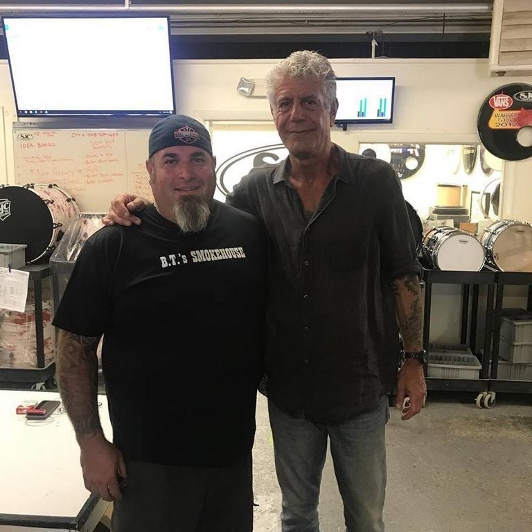 When not filming, Bourdain and others were served catering from Sturbridge BBQ joint B.T.’s Smokehouse.