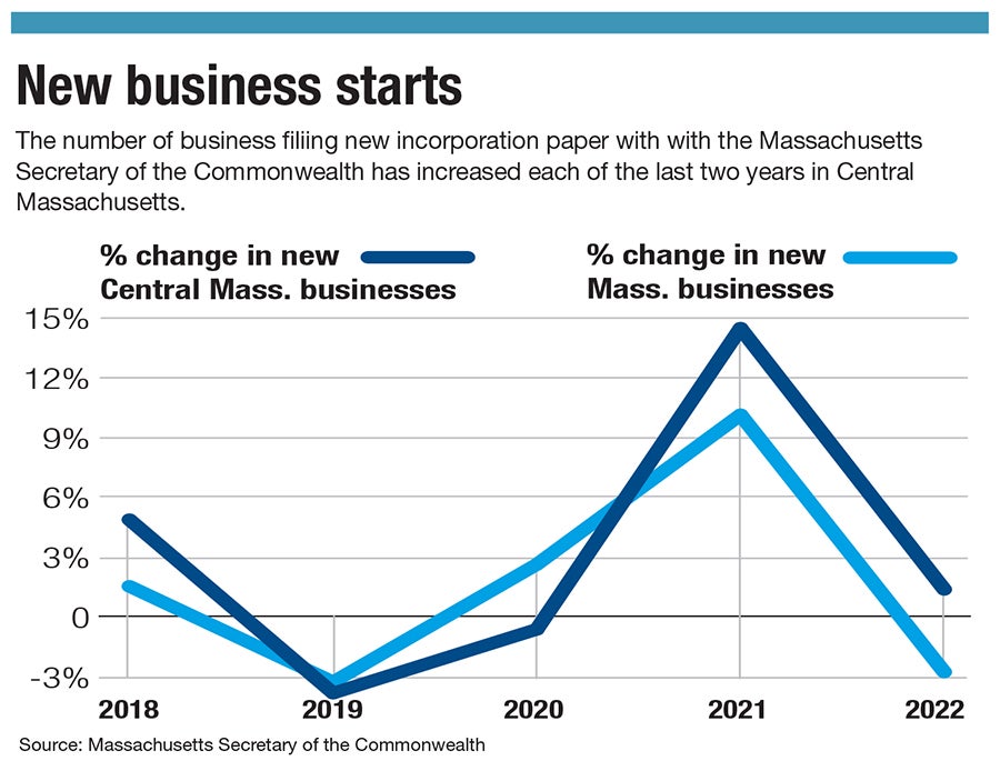 While Central Massachusetts was on the rise last year, the state overall had a 2.8% decrease in new business starts in 2022. The U.S. as a whole was trending down, too, with a 6.2% decrease in new businesses last year, although still above pre-pandemic levels, according to the U.S. Census Bureau.