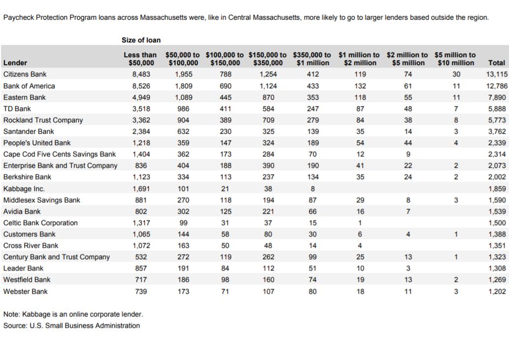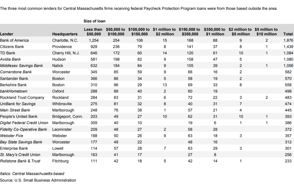 Roughly 18,000 loans were made to Central Massachusetts businesses as part of the federal aid program. Of those, about 8,000, or almost 45%, passed through local banks or credit unions.