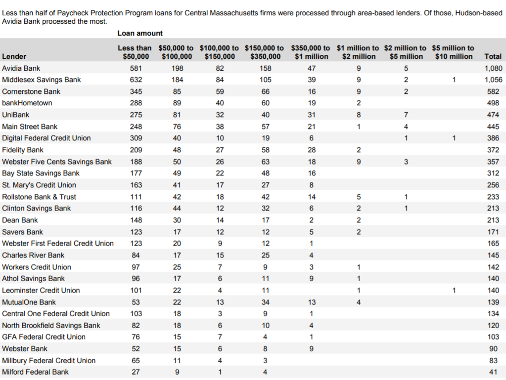 Among all PPP lending statewide, Natick-based Middlesex Savings Bank — the largest Central Massachusetts-based bank by deposits — ranked 12th in number of loans. Hudson-based Avidia Bank was 13th. In all, Massachusetts companies identified using roughly 700 lenders for the program.