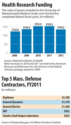 Defense spending. Massachusetts has long been a chief beneficiary of Pentagon spending since World War II. But with the pressure to rein in spending, the end of military involvement in Iraq and the impending drawdown of activity in Afghanistan, defense contracts to the Bay State could very well take a large hit. After reaching a peak of $15.5 billion in fiscal year 2009, the total value of defense contracts to Massachusetts companies and organizations fell back to $13.9 billion in fiscal 2011.