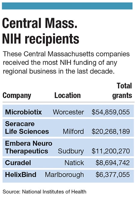 The largest business by NIH research funding in Central Massachusetts by far is Microbiotix, a clinical stage biopharmaceutical firm working to discover and develop drugs to target infectious diseases. Microbiotix has brought in nearly $55 million in NIH funding in the past decade.
