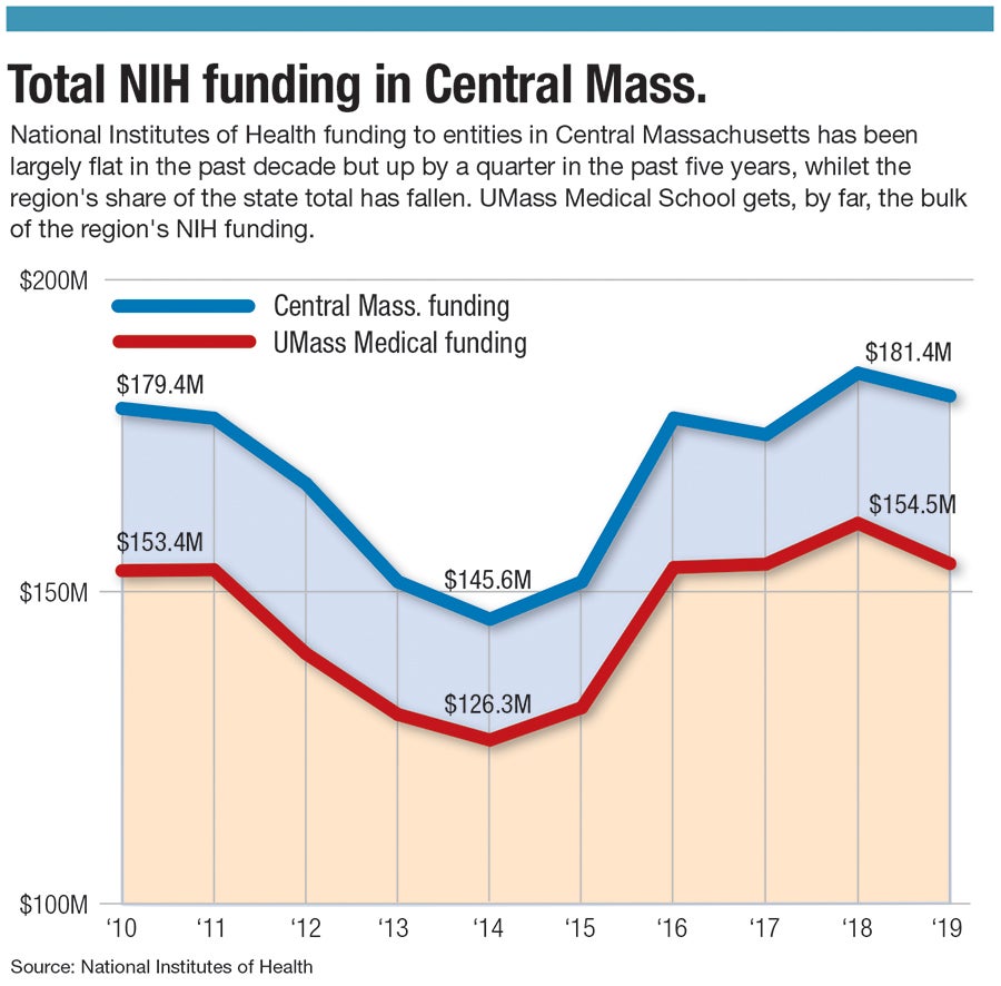 An overwhelming majority of NIH funding coming to Central Massachusetts each year goes to UMass Medical School, which regularly earns the most funding in Massachusetts of any recipient outside Boston and Cambridge.