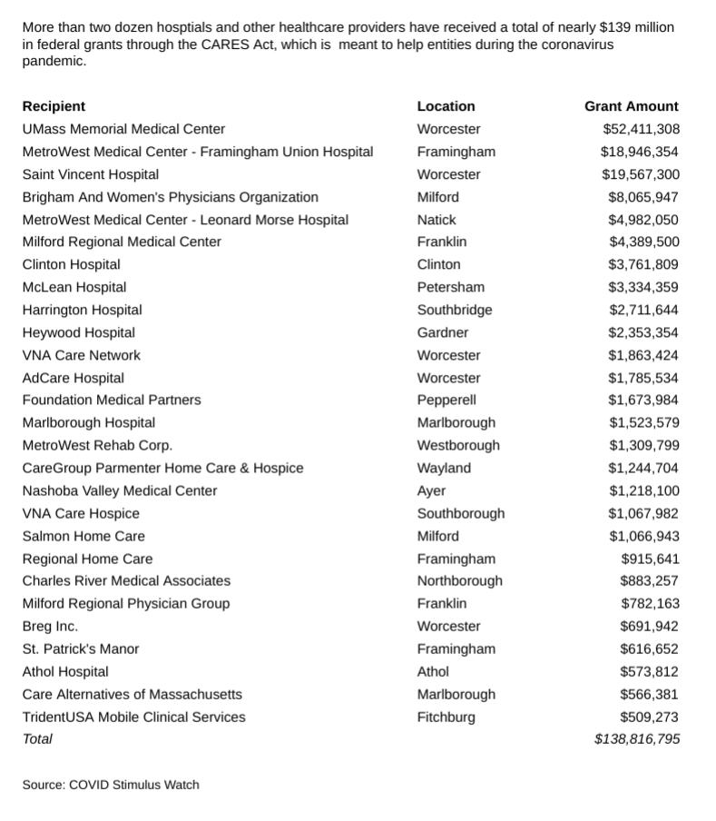In Worcester, UMass Memorial Medical Center has received $52 million, and Saint Vincent Hospital has gotten nearly $20 million, according to a review of federal health grants by the website COVID Stimulus Watch, a project of Good Jobs First, a group tracking federal business subsidies and tax incentives. All 26 Central Massachusetts healthcare grants were received in early to mid-May.