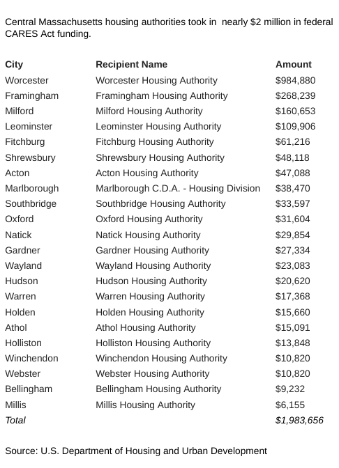In all, 22 housing authorities in the area shared in the state’s $17.8 million in funding from the federal CARES Act. Worcester took in the most at $984,880, followed by Framingham with $268,239 and Milford with $160,653.