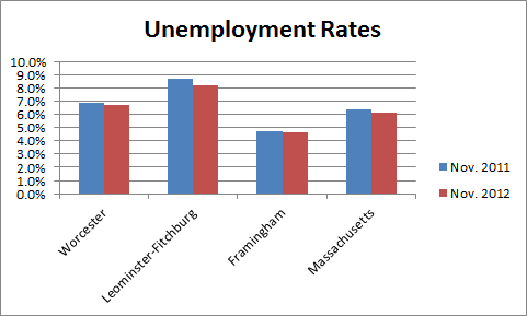 Unemployment rates in the geographic regions of Central Massachusetts tracked by the state’s Executive Office of Labor and Workforce Development (EOLWD) were all down in November compared to a year ago, the agency said.