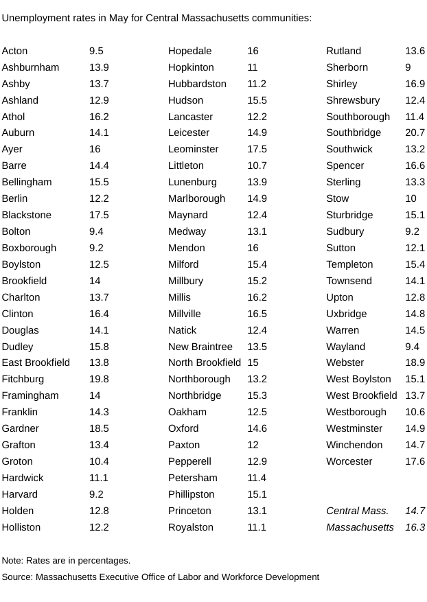The worst unemployment rate in Central Massachusetts is in Southbridge at 20.7%, followed by Fitchburg at 19.8%. Among the area’s largest communities, Framingham’s rate in May was 14.0%, Leominster was 17.5%, Marlborough’s was 14.9%, and Shrewsbury’s was 12.4%.