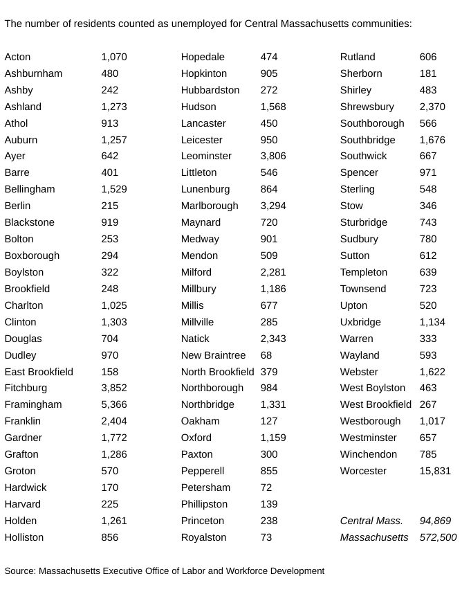 Across Central Massachusetts, nearly 95,000 residents were out of work in May, according to a Worcester Business Journal analysis of Massachusetts Executive Office of Labor and Workforce Development data. That’s nearly 5,000 more people than were counted a month prior.