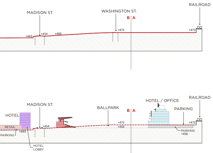 Augustus said topographic and soil issues on the ballpark footprint itself, along with buying and knocking down commercial buildings standing in the way, were underestimated. In one instance, the city had to pay $6 million to relocate a data center from one of the buildings.