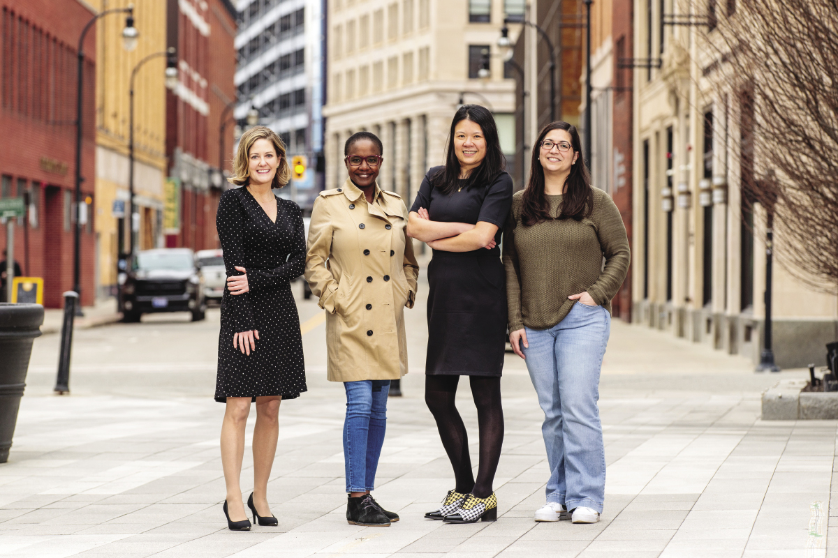 (From left) Juile Bowditch, executive director of CASA Project Worcester County; Elizabeth Wambui, director of diversity, inclusion, and community impact at Fontaine Bros.; AiVi Nguyen, partner at Prince Lobel Tye; and Erin Jansky, chief human resources officer at Webster First Federal Credit Union; all child-free by choice, they've experience first-hand the misconceptions of child-free women in the workplace. PHOTO MATT WRIGHT
