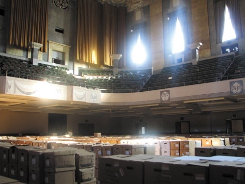 But the city hasn’t used it in about 15 years and its main function now is as a temporary repository for state court records, which are neatly stacked in file boxes on the floor of the large auditorium.