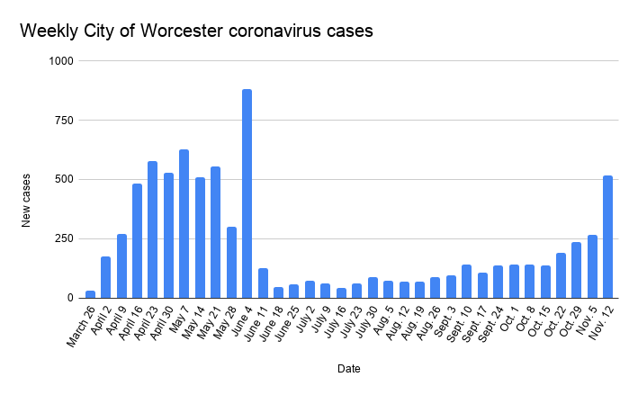 Clark’s abrupt move of classes online comes as virus cases have spiked in Worcester and well beyond. The city’s weekly total of cases as of Nov. 12 was 518, its most in a week since May. The city has had nearly 8,000 cases to-date.