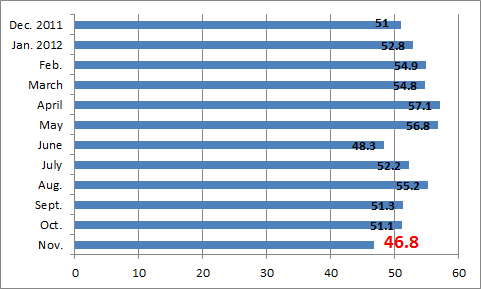 AIM’s monthly Business Confidence Index, which measures current and near-future business sentiment, registered a 46.8 on a 100-point scale in November, down from 50.9 in October, meaning there is more negative sentiment among employers. The only other month this year in which the reading fell below 50 was in June, when the index registered a 48.3.