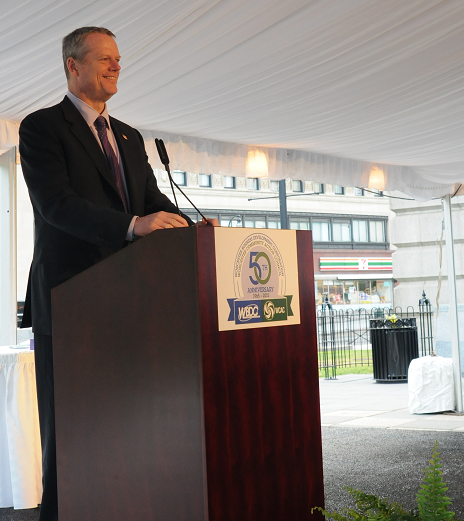 Gov. Charlie Baker stressed the importance of collaboration Thursday when he addressed the 50th-anniversary celebration of the Worcester Business Development Corp. (WBDC) and the Worcester Community Action Council (WCAC).
