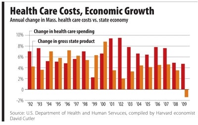 Even the less drastic health care goal of the providers group would mark a significant change from past practices. Federal data compiled by Harvard economist David Cutler showed personal health care expenditures rising an average of 6.4 percent a year between 1991 and 2009, while gross state product increased 4.6 percent, on average. Between 2008 and 2009, health expenditures rose 4.7 percent, while the general economy actually shrank 1.4 percent.