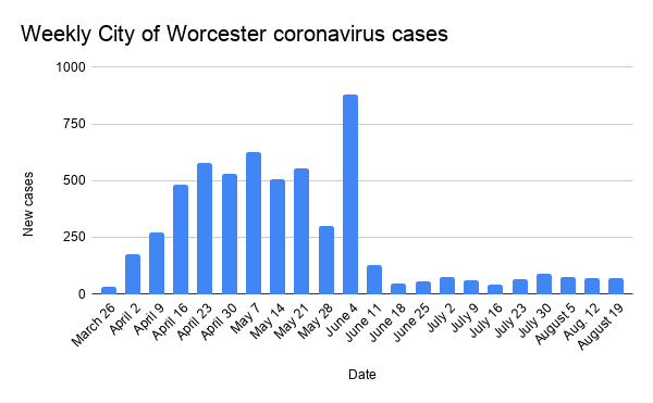 The City of Worcester reported 69 new coronavirus cases this week adding to its 5,716 total.Â