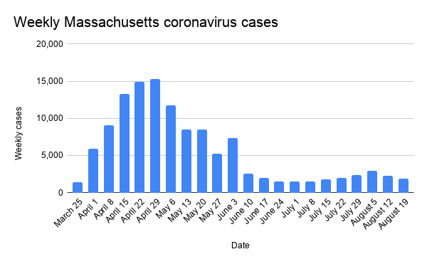 The decrease came as Gov. Charlie Baker on Aug. 7 halted his economic reopening plan, reducing the allowable outdoor gathering size to 50 from 100 and indefinitely suspending the reopening of indoor activities with a large propensity for close contact, including laser tag, roller skating, trampolines and obstacle courses.