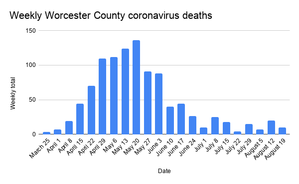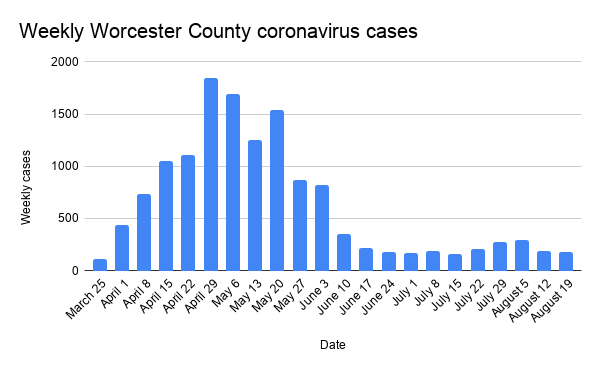 Worcester County reported 180 new coronavirus cases, and an estimated 10 deaths this week, according to the Massachusetts Department of Public Health. That comes after the 189 cases for the week ending Aug. 12, which followed three straight weeks of cases exceeding 200.