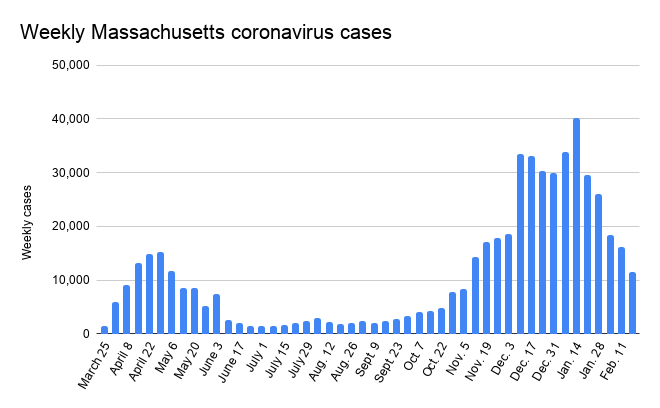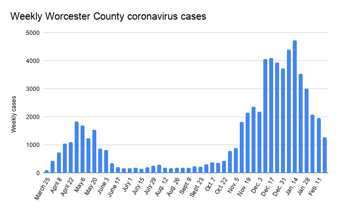In the week ending Thursday, Worcester County had 1,273 new cases. In the week ending Jan. 14, that number was 4,732. Over that same stretch of time, new weekly state cases fell to 11,569 from 40,109.