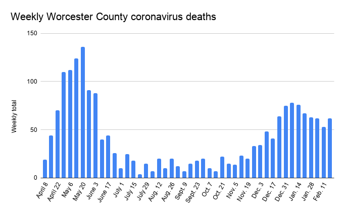 Worcester County deaths now total 1,984 since the pandemic began, up 62 in the past week. That’s slightly below the pace of a month or two ago. Statewide deaths increased by 409 to 15,373. Worcester had seven new deaths for a total of 399.