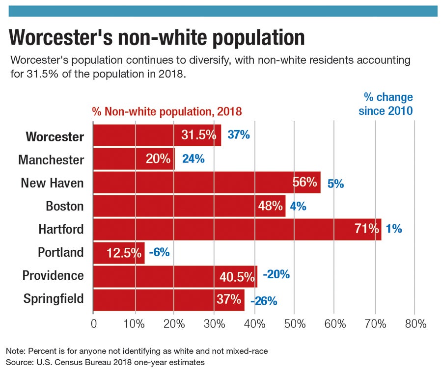 5) Worcester and Worcester County’s populations continue to diversify. In 2018, those who don’t identify as white and not mixed-race accounted for 32% of the city’s population. While Boston, Hartford and New Haven, Conn., have larger non-white populations, Worcester’s population diversified at the highest rate: 37% since 2010. Across Worcester County, the non-white population has rose over that time by 34%.