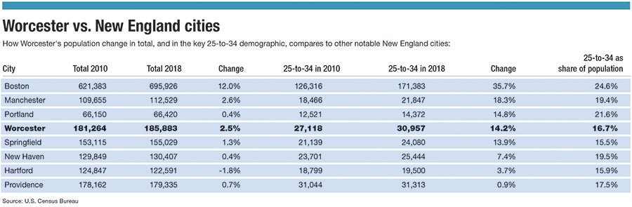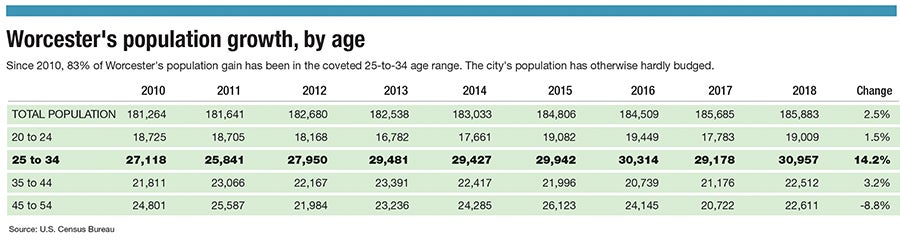 Of the roughly 4,600 people Worcester has added since 2010, more than eight out of 10 have been between the ages of 25 and 34, according to new U.S. Census Bureau estimates released this fall.