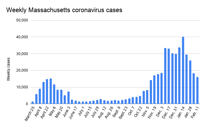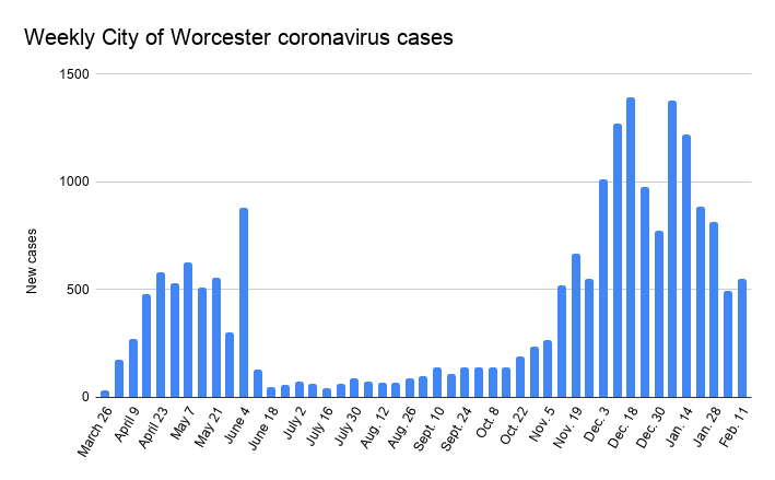 In Worcester, 550 new cases in the past week bring the city’s total so far to 19,871. Across Massachusetts, 16,092 new cases put the total to 523,258. In the city’s case, new cases have dropped below highs from last spring, while in the state’s case they remain narrowly above that mark.
