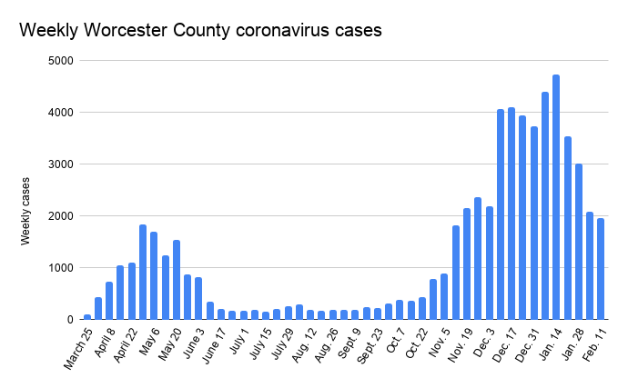 New coronavirus cases in Worcester County have fallen so far from such a high peak in the past few weeks that cases are finally nearly back down to their previous high from last spring.