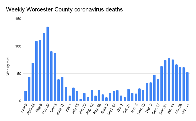 Worcester County had 53 new deaths in the past week to bring its total to 1,922 since the pandemic began. Worcester has had 10 new reported deaths in the past week and 392 in total. Across Massachusetts, 475 new deaths brings the statewide total to 14,964. The state’s per-capita death rate since the start of the pandemic trails only New Jersey and New York, two other states hit badly early in the pandemic last year, according to a New York Times tally.