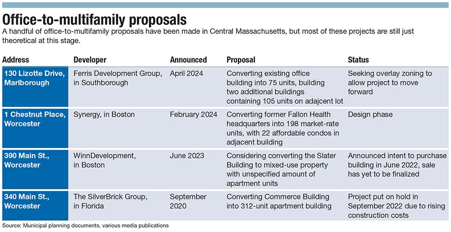 A few developers have proposed office-to-multifamily projects in Central Massachusetts, ranging from urban structures in Worcester to suburban buildings in Marlborough. Others are standing on the sidelines, waiting to see how these plans play out.