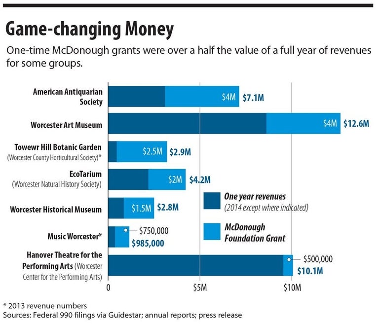 The funds were divided among the EcoTarium, the American Antiquarian Society, the Worcester Art Museum, Tower Hill Botanic Garden, the Worcester Historical Museum, Music Worcester and the Hanover Theatre for the Performing Arts.