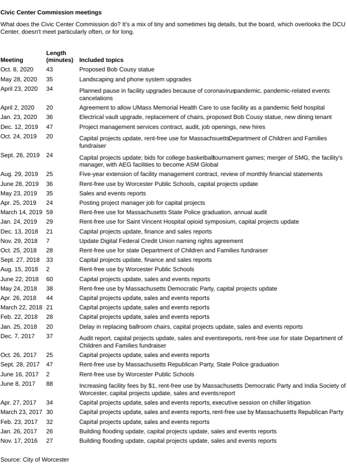 In 2019, the Civic Center Commission met for just under five hours in total. It was even less the year before, with meetings often every month or two, and lasting just over half an hour on average. Twice, the board has met for a total of just two minutes: to allow Worcester Public Schools to use the arena rent-free for a day for a staffwide meeting before the school year began.