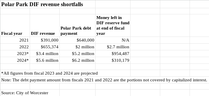 However, those shortfalls have been offset by the City’s DIF reserve fund, which received its most significant contribution in November 2021 when the City sold a publicly-owned property on Green Street for $3 million to the developers of The Cove, a 171-unit, seven-story housing complex now under construction. The City had originally purchased the parcel in anticipation of needing it for Polar Park and then sold it when it wasn’t necessary for the ballpark.