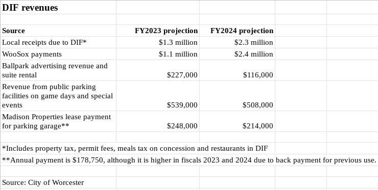 Revenue in the stadium district comes from a variety of sources, said Batista. The overall cash flow is only marginally tied to the success of the Worcester Red Sox in attracting fans to the Canal District, and those monies – parking fees and taxes on concessions and restaurant meals – make up a small portion of the DIF revenues.