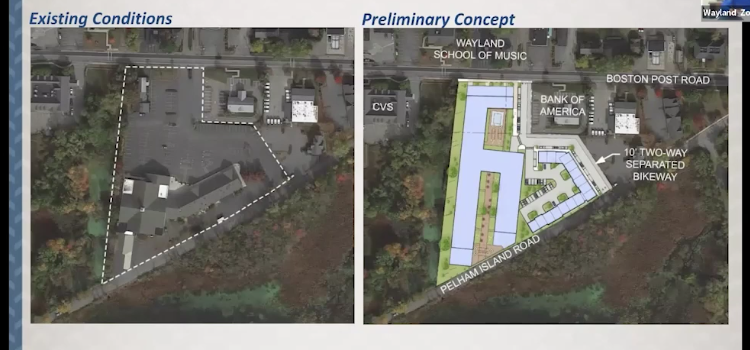 Mill Creek would construct a small road connecting the two roads on either side of the site. The development is proposed for a 3.5-acre lot between Boston Post Road and Pelham Island Road in Wayland. There is a shipping business and a dry cleaner located on the proposed development site. A Whole Foods supermarket previously operated on part of the site at 297 Boston Post Road, but that space is now covered in black top and empty.