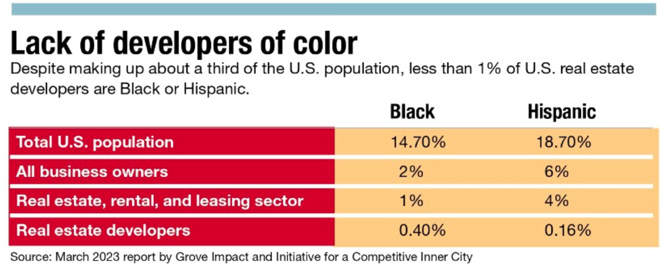 At the same time, the real estate development space is facing a stunning lack of diversity, according to a March 2023 joint study conducted by Roxbury-based nonprofit Initiative for a Competitive Inner City and Washington D.C.-based consulting firm Grove Impact.