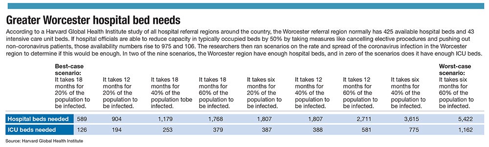 Most who contract coronavirus aren’t expected to need intensive care, but only 43 such beds are typically available in Greater Worcester. If only 20% of area residents get the virus and the curve is flattened to 18 months, a projected 126 ICU beds will be needed, according to the Harvard researchers.
