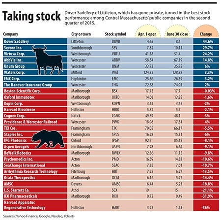 Amid a relatively flat second quarter for U.S. stock markets, there were a handful of Central Massachusetts-based companies whose shares did well between April 1 and June 30, led by Dover Saddlery of Littleton.