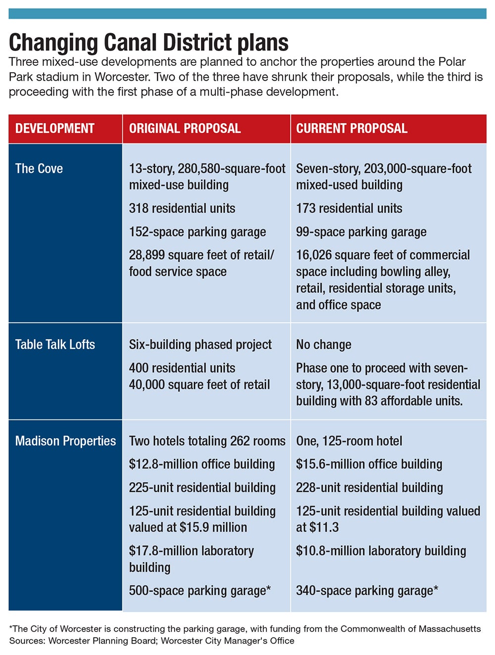 When the main mixed-use development inside Polar Park’s special tax district, which is designed to help pay off the cost of the $160-million ballpark in Worcester, faced delays and downsizing, two new developments were proposed to fill in any gaps. Now, one of those two lifeboats appears to be about half the size of what it was initially promised.