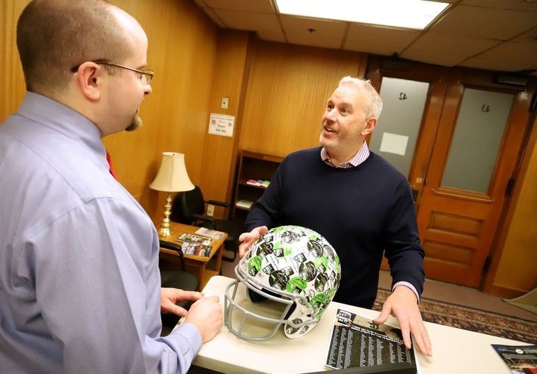 With the gift of a football helmet decorated with stickers bearing the names and hometowns of Massachusetts residents who signed a petition calling for the ability to place bets on sporting events online or through a mobile app in tow, DraftKings official James Chisholm stopped by Rep. Ann-Margaret Ferrante’s office to keep mobile betting on the Economic Development and Emerging Technologies Committee chairwoman’s front burner.
