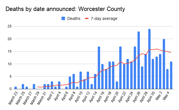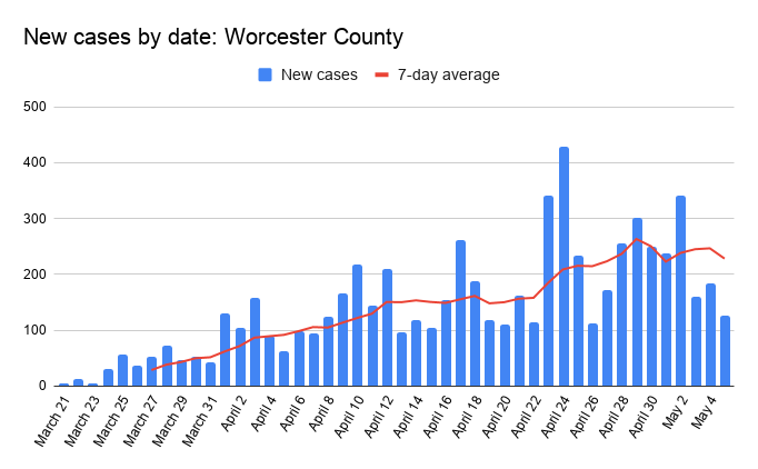 Statewide, cases stood at a seven-day rolling average of 2,016 on April 30, and have now decreased to 1,710. Worcester County has gone from an average of 250 down to 228 since the end of April.Â