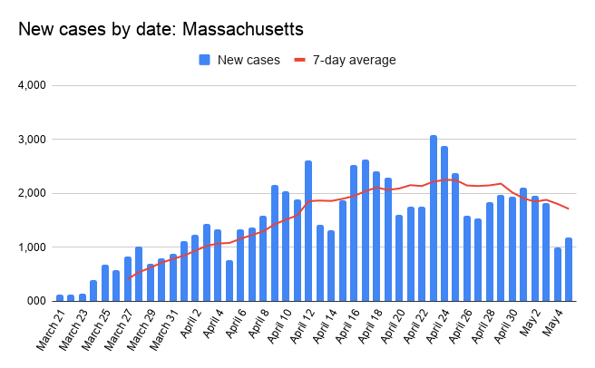 Coronavirus cases in Massachusetts have seen a large decrease in daily reported coronavirus cases, according to Massachusetts Department of Public Health data.Â