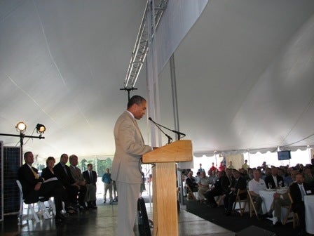 Both Feldt and Patrick touted a new state law promoting renewable energy and conservation. Patrick said one provision will encourage the purchase of solar equipment by promising owners a good rate when they sell power back onto the grid.