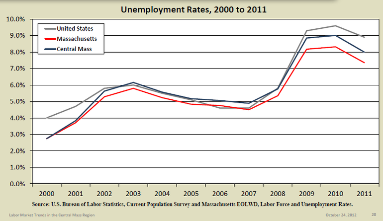 The region’s unemployment rate, which reached a high of 9.2 percent in the recession, has come down somewhat. The region lost 4.5 percent of its jobs from the end of 2007 to the end of 2009, and gained back 2.6 percent over the following two years. Unemployment in the Worcester area sits at 7.1 percent, state economic officials announced this week. That’s down from 7.8 percent a year ago, but still higher than the state average of 6.5 percent. Nationally, unemployment recently dipped below 8 percent for the first time in more than 40 months.