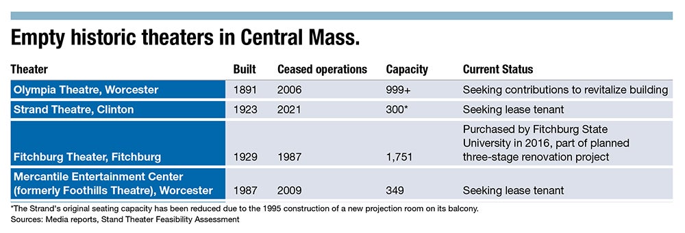 One way to insulate these venues from the recent struggles of the theater industry is to diversify their potential uses. Figures involved in efforts to reoccupy the Strand Theatre in Clinton and the former Foothills Theatre in Worcester, now dubbed the Mercantile Entertainment Center, feel the best path forward for these venues is for them to be multi-use spaces.