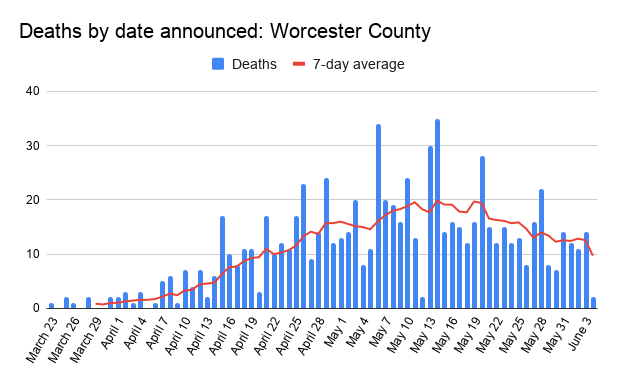 In other newly reported data Thursday, Worcester County had 64 new coronavirus cases and two more fatalities, according to the Massachusetts Department of Public Health. The new cases contribute to the 11,529 total in the county.